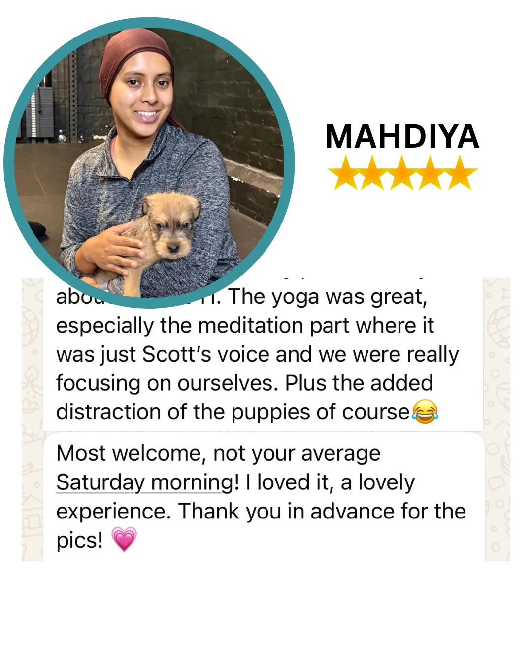 Our Puppy Yoga sessions are for everyone aged 10+ who want to move, laugh and de-stress — no experience needed!